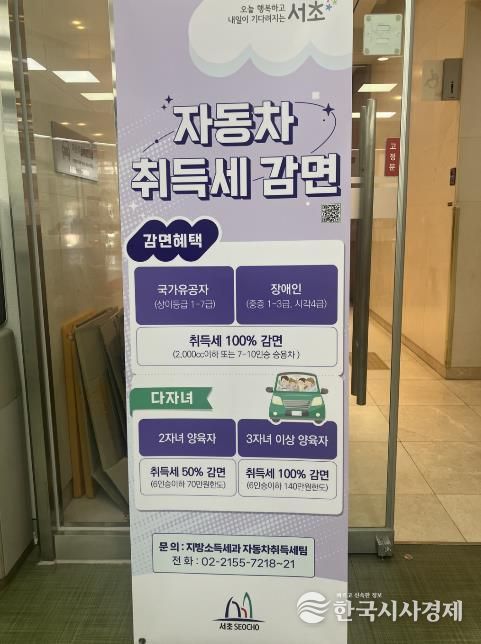 한국시사경제 이정이 기자 | 서울 서초구가 차량취득세 감면 대상자의 알권리를 강화하고 납세자의 불이익을 사전에 막기 위해 구청 1층 자동차등록 민원실 입구에 '차량취득세 감면 홍보 배너'를 설치하고 안내에 나선다고 밝혔다.