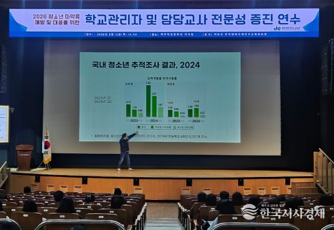 한국시사경제 노승선 기자 | 제주특별자치도교육청은 12일 제주학생문화원 대강당에서 도내 학교 관리자와 업무 담당 교사 400여 명을 대상으로 ‘2026 청소년 마약류 예방 및 대응 전문성 증진 연수’를 개최했다.