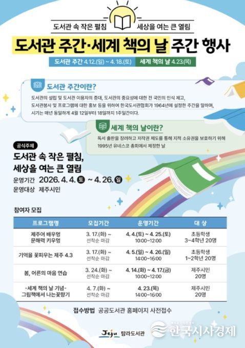 한국시사경제 노승선 기자 | 제주시 탐라도서관은 도서관 주간과 세계 책의 날을 맞아 ‘도서관 속 작은 펼침, 세상을 여는 큰 열림’을 주제로 다양한 독서문화 행사를 운영한다.