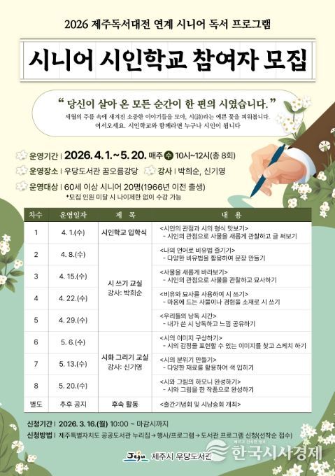 한국시사경제 노승선 기자 | 제주시 우당도서관은 2026 제주독서대전과 연계해 시민의 삶과 경험을 문학적 가치로 재발견하는 특별 프로그램인 ‘시니어 시인학교’ 참여자를 모집한다.