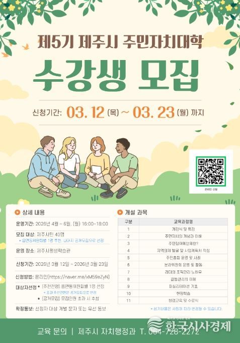 한국시사경제 노승선 기자 | 제주시는 지방자치를 선도할 전문성과 실천 역량을 갖춘 지역리더 양성을 위해 ‘제5기 제주시 주민자치대학’ 수강생을 모집 중이다.