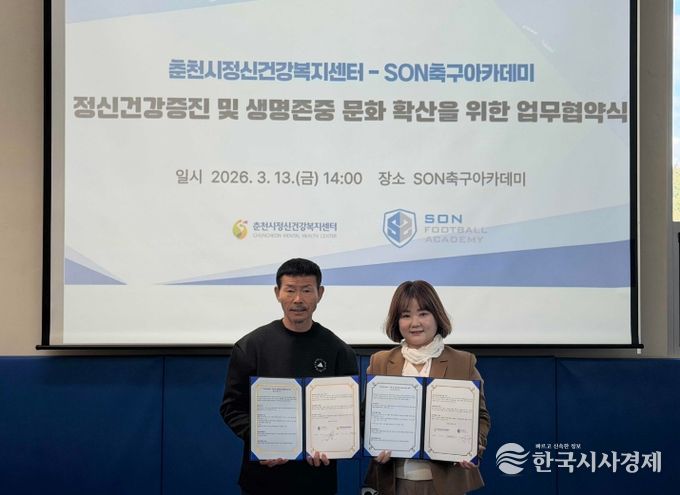 한국시사경제 의료보건팀 | 춘천시정신건강복지센터(센터장 김미정)와 SON축구아카데미(이사장 손웅정)가 13일 지역사회 정신건강서비스 지원 활성화 및 생명존중 문화 확산을 위해 협약을 체결했다.