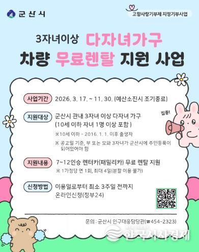 한국시사경제 전북취재본부 | 군산시가 3자녀 이상 다자녀 가구의 이동 편의를 돕고 가족 단위 여가 활동을 장려하기 위해 '3자녀 이상 다자녀 가구 차량 무료 렌탈 지원 사업'을 17일부터 본격 시행한다고 밝혔다.