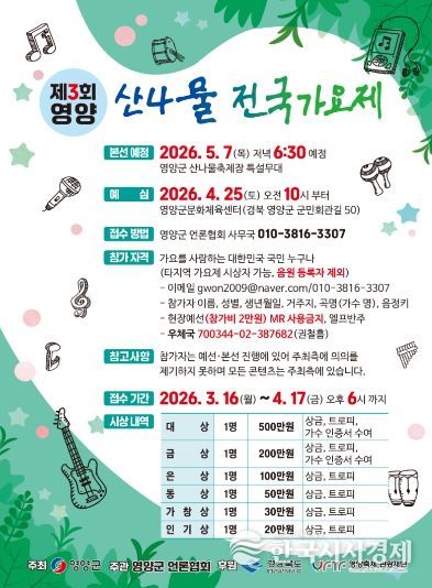 오도창 영양군수는 “올해로 3회째를 맞는 이번 가요제가 신인 가수들의 꿈을 이루는 통로이자, 영양의 풍성한 문화와 전통을 널리 알리는 계기가 되길 바란다”며, “주관사인 영양군언론협회와 협력해 내실 있고 탄탄한 행사를 준비하겠다”고 밝혔다.