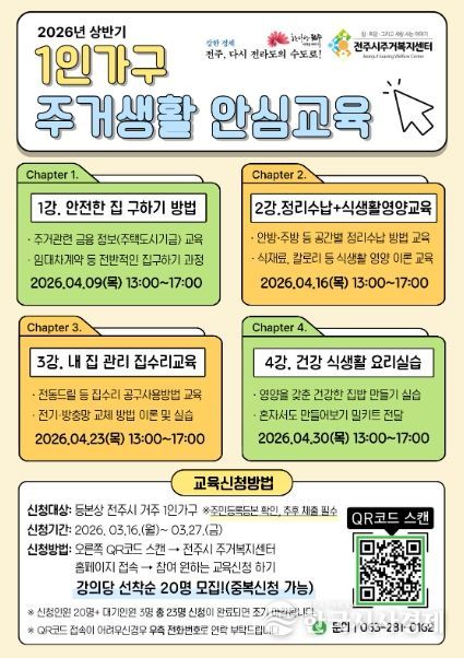 한국시사경제 문화팀 | 전주시 주거복지센터(센터장 오은주)는 1인 가구의 안정적이고 독립적인 주거 정착을 돕기 위해 오는 4월 9일부터 30일까지 매주 목요일 오후 1시부터 약 4시간 동안 전주시 실거주 1인 가구를 대상으로 ‘2026년 상반기 1인 가구 주거생활 안심교육’을 운영한다.