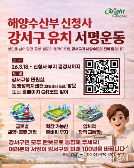 이번 서명운동은 오는 3월 18일부터 해양수산부 청사 부지가 최종 결정될 때까지 진행되며, 강서구민의 유치 의지를 중앙정부와 국회에 전달해 추진 동력을 확보하기 위해 마련됐다.