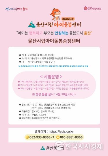 한편 울산시는 공공 돌봄 수요 증가에 대응하기 위해 거점형 시립아이돌봄센터 확충을 지속적으로 추진하고 있다.