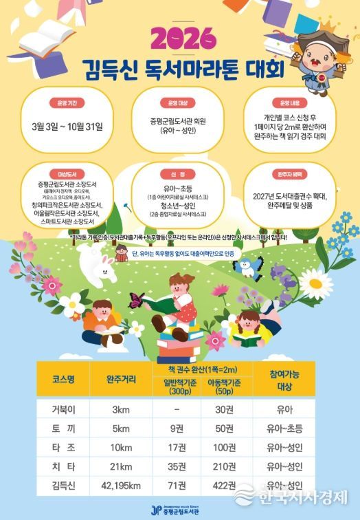 한국시사경제 충북취재본부 | 충북 증평군립도서관이 책 읽는 문화 확산을 위해 ‘김득신 독서마라톤’ 대회를 이달부터 10월까지 운영한다고 19일 밝혔다.