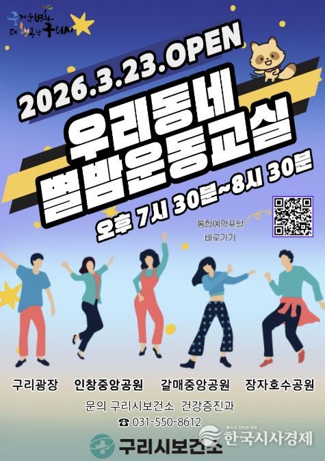 한국시사경제 경기북부취재본부 | 구리시는 3월 23일부터 10월 30일까지 지역 주민의 건강증진과 규칙적인 신체활동 실천을 돕기 위해 구리광장, 인창중앙공원, 갈매중앙공원, 장자호수공원 등 4개소에서 ‘우리동네 별밤운동교실’을 운영한다고 밝혔다.