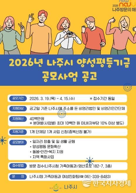 한국시사경제 권충언 기자 | 전남 나주시가 일·생활 균형과 양성평등 문화 확산, 돌봄과 안전 복지 지원을 위한 ‘2026년 나주시 양성평등기금 공모사업’을 추진한다.