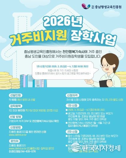 한국시사경제 문화팀 | 충남평생교육진흥원이 지역 대학생의 주거비 부담 완화와 안정적인 학업 환경 조성을 위해 대학생 거주비지원사업을 확대해 추진한다고 20일 밝혔다.