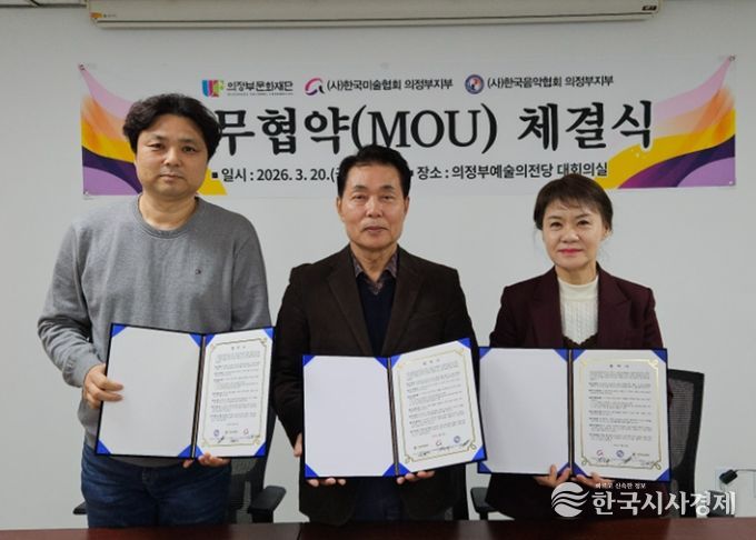 한국시사경제 윤광희 기자 | (재)의정부문화재단과 (사)한국미술협회 의정부지부, (사)한국음악협회 의정부지부는 2026년 지역 문화예술 발전과 상호 협력 강화를 위한 3자 간 업무협약(MOU)을 체결했다.