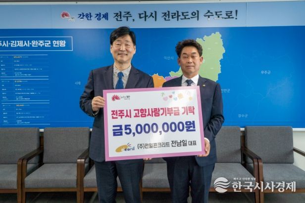 전남일 ㈜전일콘크리트 대표는 20일 전주 부시장실을 방문해 마음의 고향인 전주를 응원하는 마음을 담은 고향사랑기부금 500만 원을 기부했다.