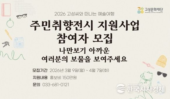 한국시사경제 이정이 기자 | 평화 경제 거점 도시 강원 고성군 산하 (재)고성문화재단은 주민이 자신의 취향과 삶의 이야기를 전시로 풀어내는 참여형 문화사업 ‘주민취향전시 지원사업’을 추진한다.