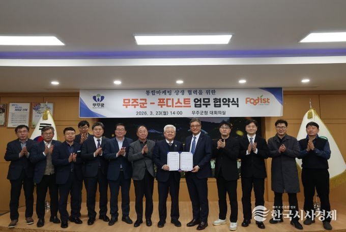한국시사경제 김숙영 기자 | 무주군은 지난 23일 푸디스트(주)와 농산물 통합마케팅 상생협력을 위한 업무협약을 체결했다고 밝혔다. 이날 협약식에는 황인홍 무주군수와 박성하 푸디스트(주) FSBU장을 비롯한 농협 관계자 20여 명이 참석해 의미를 더했다.