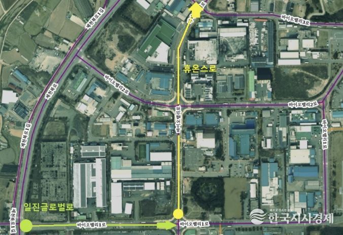 시는 지난 1월 기업 유치와 국제 교류 확대를 위해 지역 경제 활성화와 사회 발전에 기여한 휴온스와 일진글로벌의 기업 명칭을 활용해 ‘휴온스로’와 ‘일진글로벌로’를 부여했다. 명예도로명의 사용 기간은 5년 이내이며, 우편물 수령 등 실제 주소로는 사용할 수 없다.