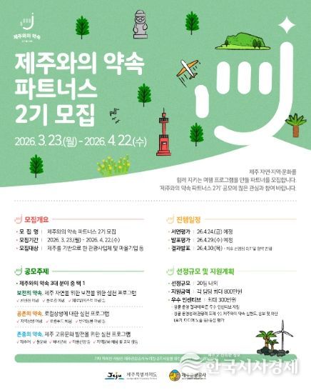 한국시사경제 문화팀 | 제주특별자치도와 제주관관공사(사장 고승철)는 오는 4월 22일까지 온라인 채널을 통해 지속 가능한 제주관광을 위한 실천프로젝트 지원사업인 ‘제주와의 약속 파트너스 2기’ 공모를 추진하고 있다고 24일 밝혔다.