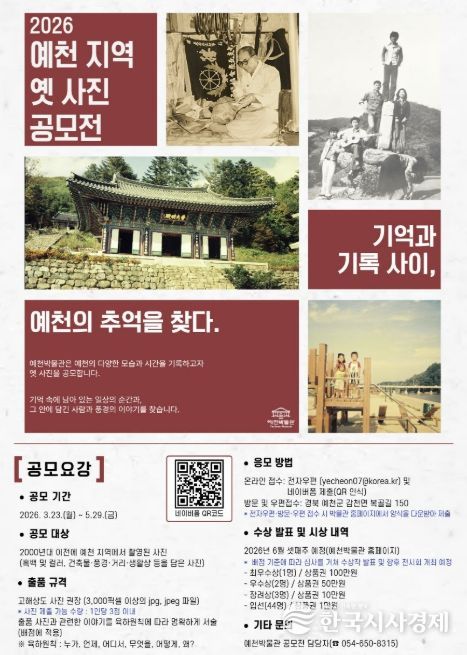 한국시사경제 권충언 기자 | 예천박물관은 지역의 역사와 생활상을 담은 기록을 수집·공유하기 위한 ‘2026 예천 지역 옛 사진 공모전 – 기억과 기록 사이, 예천의 추억을 찾다’ 공모전을 5월 29일까지 개최한다.