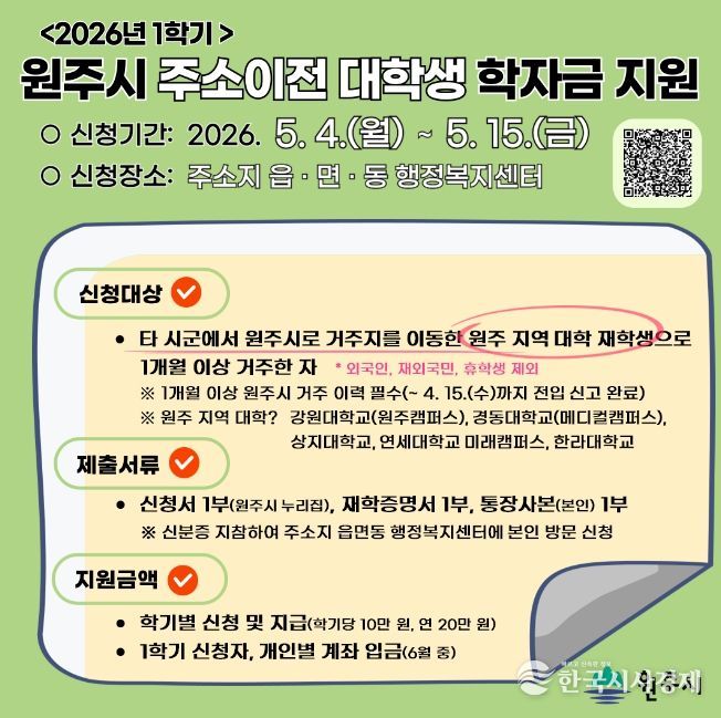 한국시사경제 권충언 기자 | 원주시는 전입신고를 마치고 원주시민이 된 대학생에게 상·하반기 각 10만 원씩 연간 20만 원의 학자금을 지원한다.