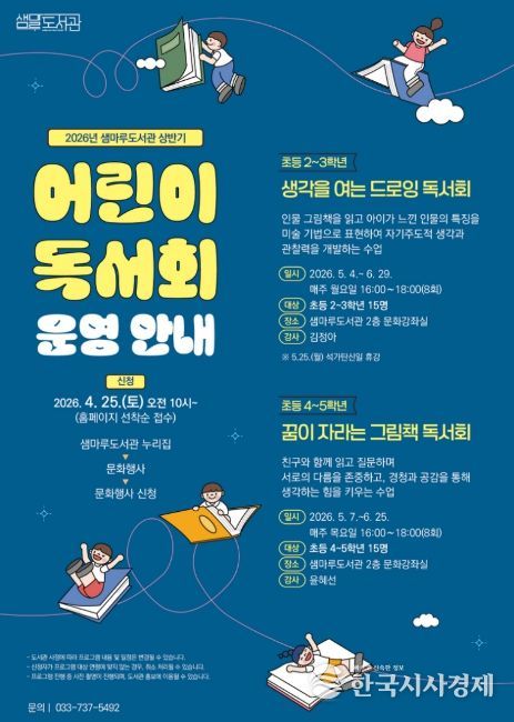 한국시사경제 권충언 기자 | 원주시 샘마루도서관은 오는 5월부터 6월까지 관내 어린이를 대상으로 ‘상반기 어린이 독서회’을 운영한다.