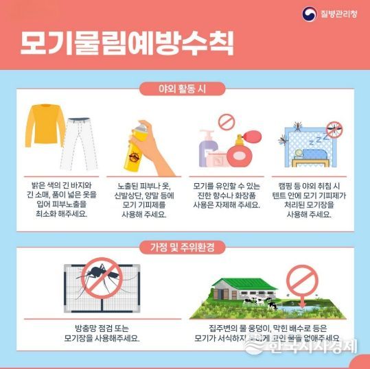 모기 매개 감염병 예방을 위해서는 야외활동 시 긴 옷을 착용하고 모기 기피제를 사용하는 등 모기에 물리지 않도록 주의해야 하며, 가정 내에서는 방충망 점검과 모기 서식지 제거 등 환경 관리를 철저히 해야 한다.