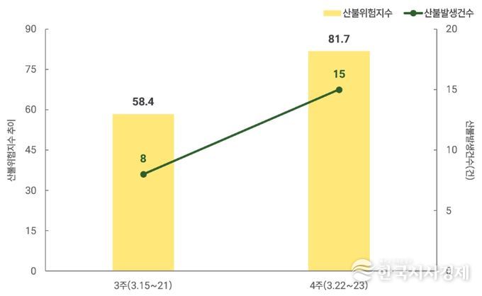 올해 3월(15시 기준) 전국 산불위험지수를 분석한 결과, 이번 주(22일~23일) 평균위험지수는 81.7로 지난 주(15일~21일, 58.4)보다 23.3 상승했다. 산불 발생 건수도 지난주 8건에 그쳤으나, 이번 주 이틀(22일~23일) 동안 15건이 발생해 산불위험지수 상승과 함께 산불발생도 빠르게 증가하는 것으로 나타났다.