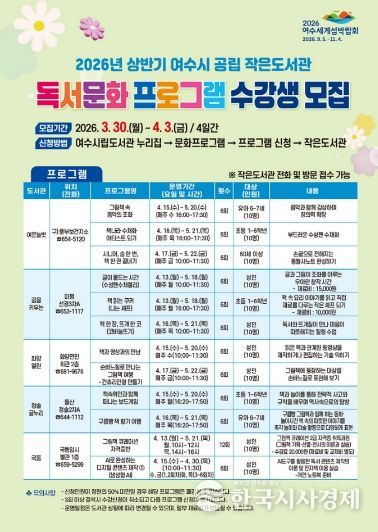 한국시사경제 전남취재본부 | 여수시는 오는 3월 30일부터 4월 3일까지 공립 작은도서관 ‘2026년 상반기 독서문화 프로그램’ 수강생을 모집한다고 밝혔다.