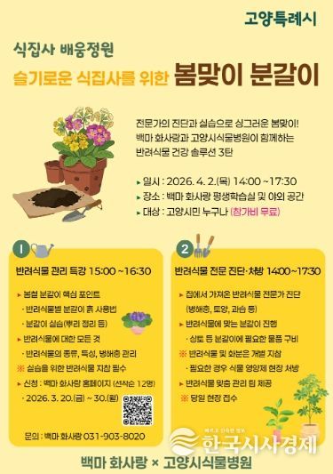 식집사 배움정원은 고양시민이라면 누구나 참여할 수 있다. 반려식물 관리 특강은 오는 3월 30일까지, 실내식물관리사 자격 취득 과정은 오는 3월 31일부터 4월 14일까지 백마 화사랑 누리집을 통해 선착순으로 접수한다. 또 반려식물 진단·처방 프로그램은 당일(4월 2일) 현장에서 신청이 가능하다.