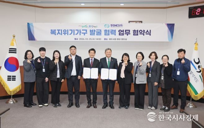 한국시사경제 문화팀 | 제주시는 3월 25일 시청 본관 회의실에서 한전MCS 제주지사(지사장 황성태)와 ‘복지위기가구 발굴 협력’ 업무 협약을 체결했다.