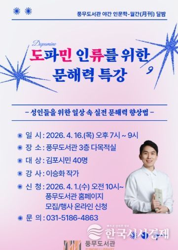 한국시사경제 윤광희 기자 | 김포시 풍무도서관은 도서관주간을 맞아 오는 4월 16일 오후 7시부터 야간 인문학 프로그램으로 ‘도파민 인류를 위한 문해력 특강’을 운영한다.
