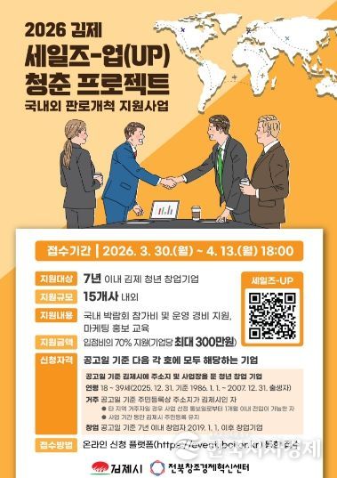 한국시사경제 김숙영 기자 | 김제시는 청년 창업기업의 시장 진출 확대와 매출 증대를 지원하기 위해 청년 창업기업 판로개척 지원 사업'2026년 김제시 세일즈-업(UP) 청춘 프로젝트'를 본격 추진한다고 밝혔다.