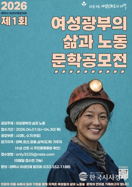 한국시사경제 권충언 기자 | 태백시 여성단체협의회(회장 김미숙)는 오는 4월 1일부터 30일까지 '2026년 여성광부의 삶과 노동' 문학 공모전을 개최한다고 밝혔다.