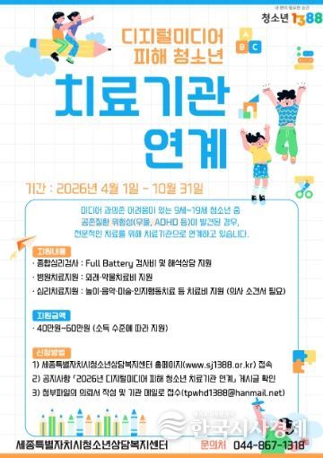 한국시사경제 세종취재분부 | 세종특별자치시청소년상담복지센터는 지역사회 내 미디어 과의존 어려움을 겪고 있는 청소년들의 건강한 성장을 돕기 위해 4월부터 10월까지 미디어 과의존 청소년을 대상으로 치료기관(병원 등) 연계 서비스를 지원한다.