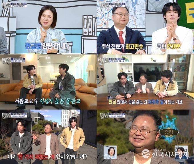 이날 방송은 ‘대한민국의 실리콘밸리’로 불리는 게임 산업의 중심지 판교 신도시를 조명하며 임장에 나섰다. 판교는 경기도 성남시 분당구에 위치한 대표적인 신도시로, IT·게임 기업들이 밀집해 있는 첨단 산업 중심지로 꼽히며 경부고속도로를 기준으로 동판교와 서판교로 구분된다. 지난 여의도 편에서의 활약으로 화제를 모은 최고민수와 배우 안재현이 게스트로 함께해 MC 양세찬과 호흡을 맞췄다.
