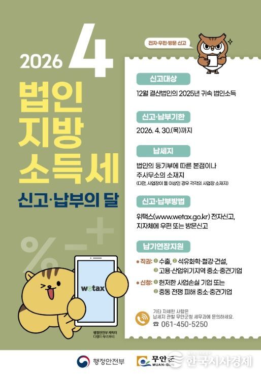 한국시사경제 권충현 기자 | 전남 무안군은 법인 소득에 대해 지방자치단체에 납부하는 법인지방소득세 신고·납부 기간을 맞아 오는 4월 30일까지 집중신고기간을 운영한다고 밝혔다.
