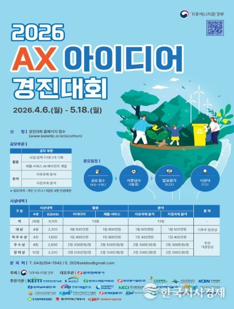 기후에너지환경부는 부처 산하 24개 공공기관과 함께 전 국민을 대상으로 ‘2026 기후부 에이엑스(AX) 아이디어 경진대회’를 4월 6일부터 5월 28일까지 개최한다고 밝혔다.
