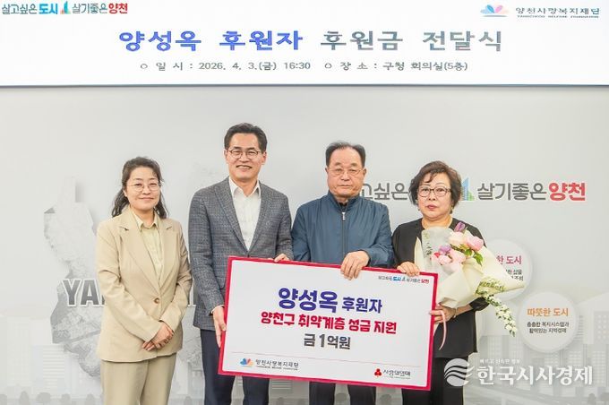이기재 양천구청장은 “평생 땀 흘려 일하며 모은 소중한 재산을 어려운 이웃과 우리 아이들을 위해 선뜻 내어주신 양성옥 어르신의 숭고한 결단에 깊은 존경과 감사를 드린다”며 “기부자님의 따뜻한 마음이 헛되지 않도록 성금을 투명하고 책임 있게 집행하겠다”고 말했다.