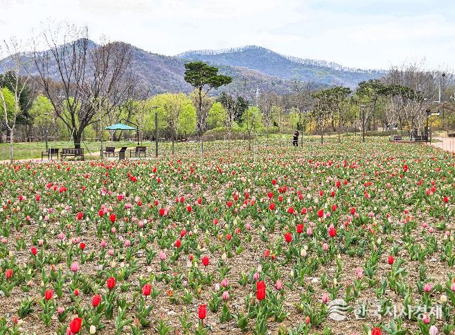 한국시사경제 충남취재본부 | 천안의 대표 명소인 삼거리공원 너른뜰 튤립정원에 10만 송이의 튤립이 꽃망울을 터트리며 시민들에게 봄의 설렘을 전하고 있다.