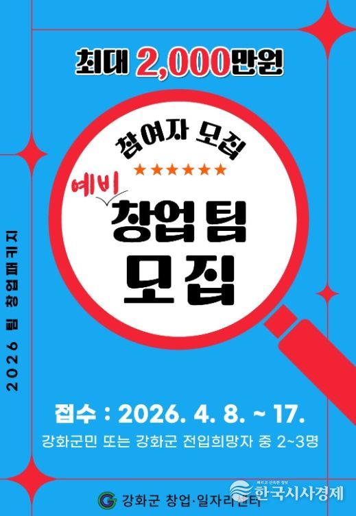 한국시사경제 경제팀 | 강화군 창업·일자리센터가 '2026년도 팀 창업패키지 지원사업' 참여자를 모집한다.