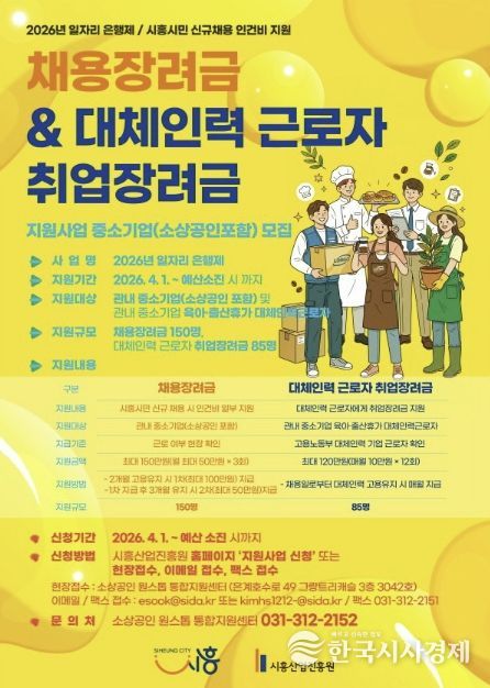 한국시사경제 경기취재본부 | 시흥시는 관내 중소기업의 신규 채용을 촉진하고 안정적인 고용 창출을 위해 ‘2026년 일자리 은행제’ 사업 참여자 모집을 4월 1일부터 시작한 가운데 예산 소진 시까지 진행한다.