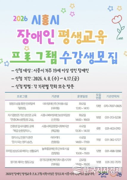 한국시사경제 경기취재본부 | 시흥시가 관내 성인 장애인의 학습권 보장과 사회참여 확대를 위해 ‘2026년 장애인 평생교육 프로그램 지원사업’을 본격적으로 시작하며, 4월 8일부터 17일까지 프로그램 운영을 위한 학습자를 모집한다.
