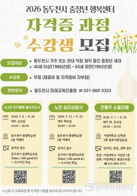 한국시사경제 경기북부취재본부 | 동두천시 미래교육진흥원은 지역 내 중장년층의 성공적인 인생 2막과 안정적인 사회 참여를 지원하기 위해 ‘2026년 중장년 행복센터 자격증 과정’ 수강생을 모집한다고 밝혔다.