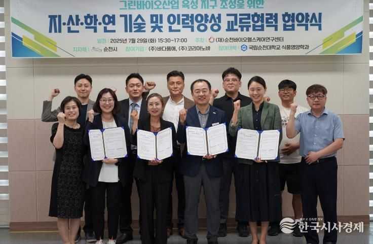 한국시사경제 전남취재본부 | (재)순천바이오헬스케어연구센터는 지난 29일 생태비즈니스센터에서 순천시 그린바이오 산업의 성장과 인재 양성을 위해 ‘지 · 산 · 학 · 연 기술 및 인력양성 교류 협력 협약’을 체결했다고 밝혔다.