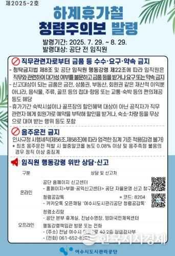 한국시사경제 전남취재본부 | 여수시도시관리공단은 부패 취약 시기인 여름 휴가철을 맞아 임직원의 공직기강 확립과 청렴문화 정착을 위해 7월 29일부터 8월 29일까지 한 달간 ‘청렴주의보’를 발령했다고 밝혔다.