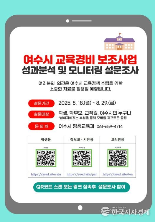 한국시사경제 전남취재본부 | 여수시는 교육경비 보조사업에 대한 시민 관심 제고와 수요자 맞춤 지원을 위해 8월 18일부터 29일까지 ‘교육경비 보조사업 성과분석 및 모니터링 설문조사’를 온라인으로 실시한다.