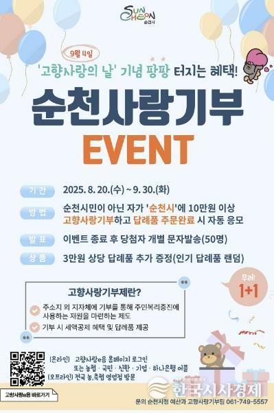 한국시사경제 전남취재본부 | 순천시는 9월 4일 ‘고향사랑의 날’을 기념해 8월 20일부터 9월 30일까지 고향사랑기부제 특별이벤트를 진행한다고 밝혔다.
