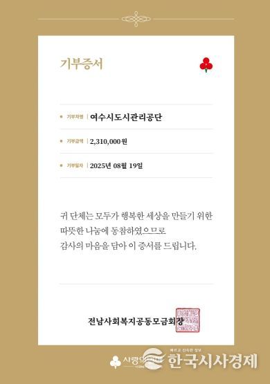 한국시사경제 전남취재본부 | 여수시도시관리공단(이사장 김유화)은 집중호우로 피해를 입은 지역 주민들의 조속한 일상 회복을 돕기 위해 성금 230여만 원을 사회복지공동모금회 전라남도지회에 기부했다고 20일 밝혔다.