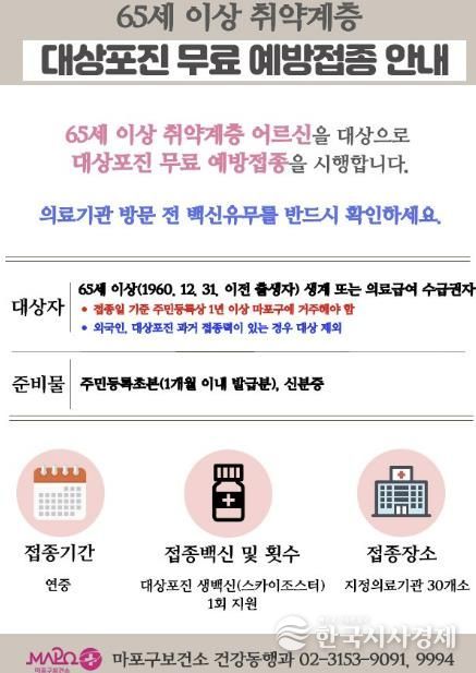 한편, 마포구는 65세 이상 어르신의 건강한 삶을 위해 무료로 연중 폐렴구균 예방접종을 시행하고 있으며 겨울철에는 인플루엔자 예방접종을 지원하고 있다.