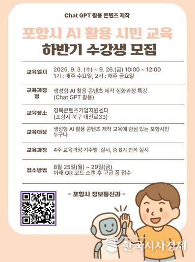 한국시사경제 한장선 객원기자 | 포항시는 지난 5월과 7월 두 차례 진행된 ‘생성형 AI 활용 콘텐츠 제작 특강’이 조기 마감되는 등 큰 호응을 얻음에 따라, 오는 9월 3일부터 12월 26일까지 하반기 과정을 새롭게 개설해 운영한다.