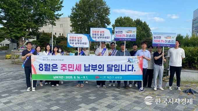 한국시사경제 전북취재본부 | 전주시는 25일 오전 완산구 선너머네거리와 덕진구 진북광장사거리 일원에서 8월 정기분 주민세 납부의 달을 맞아 시민들에게 납부 기한을 널리 알리고 성실납세 분위기를 조성하기 위한 거리 홍보 캠페인을 전개했다.